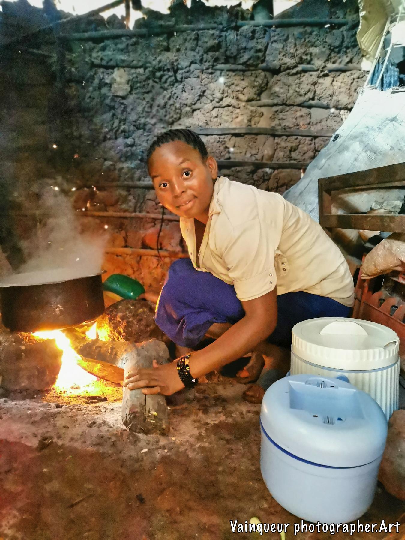 In this picture, Marceline is sitting in their kitchen and preparing lunch. After that, she will go to the tap to draw water like she does every morning.