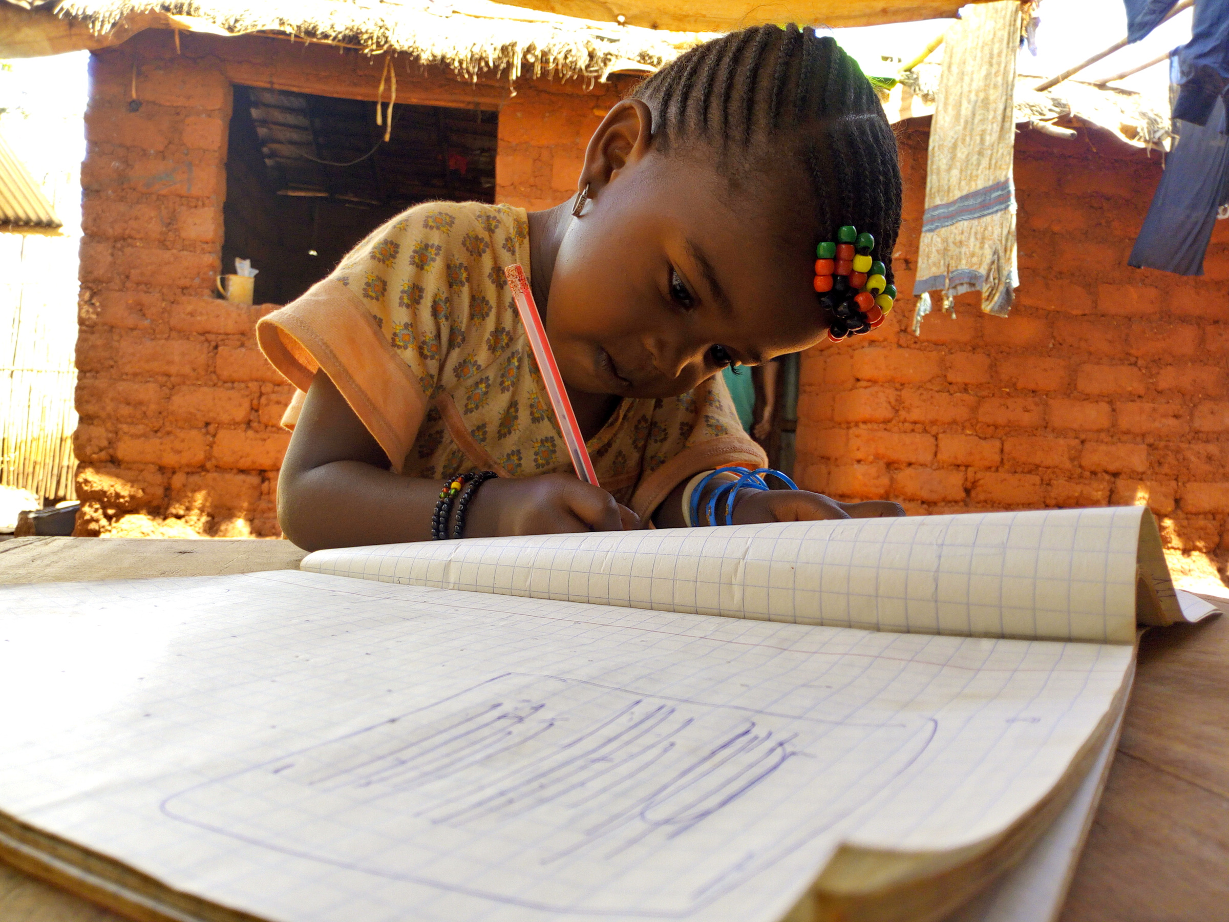 She says she will write a letter to her mother, directly takes a pen and a notebook and start drawing the lines supposedly she does a letter writing. Aziza never went to school but she is interested in school education.