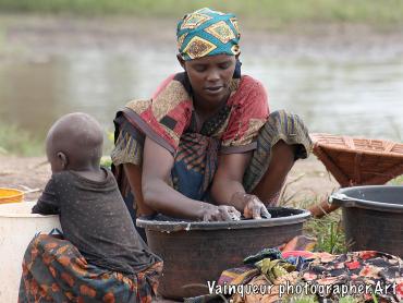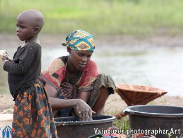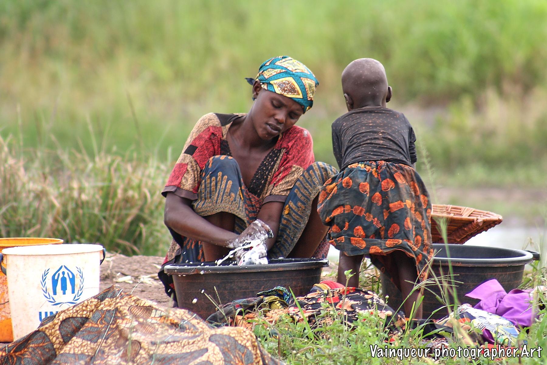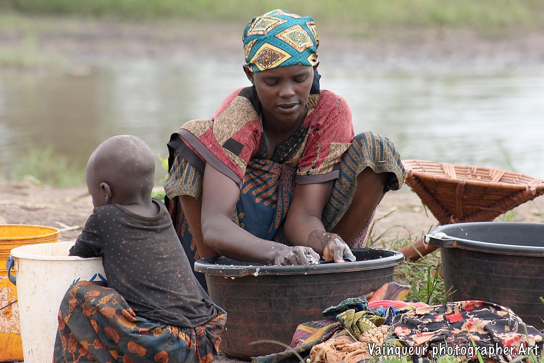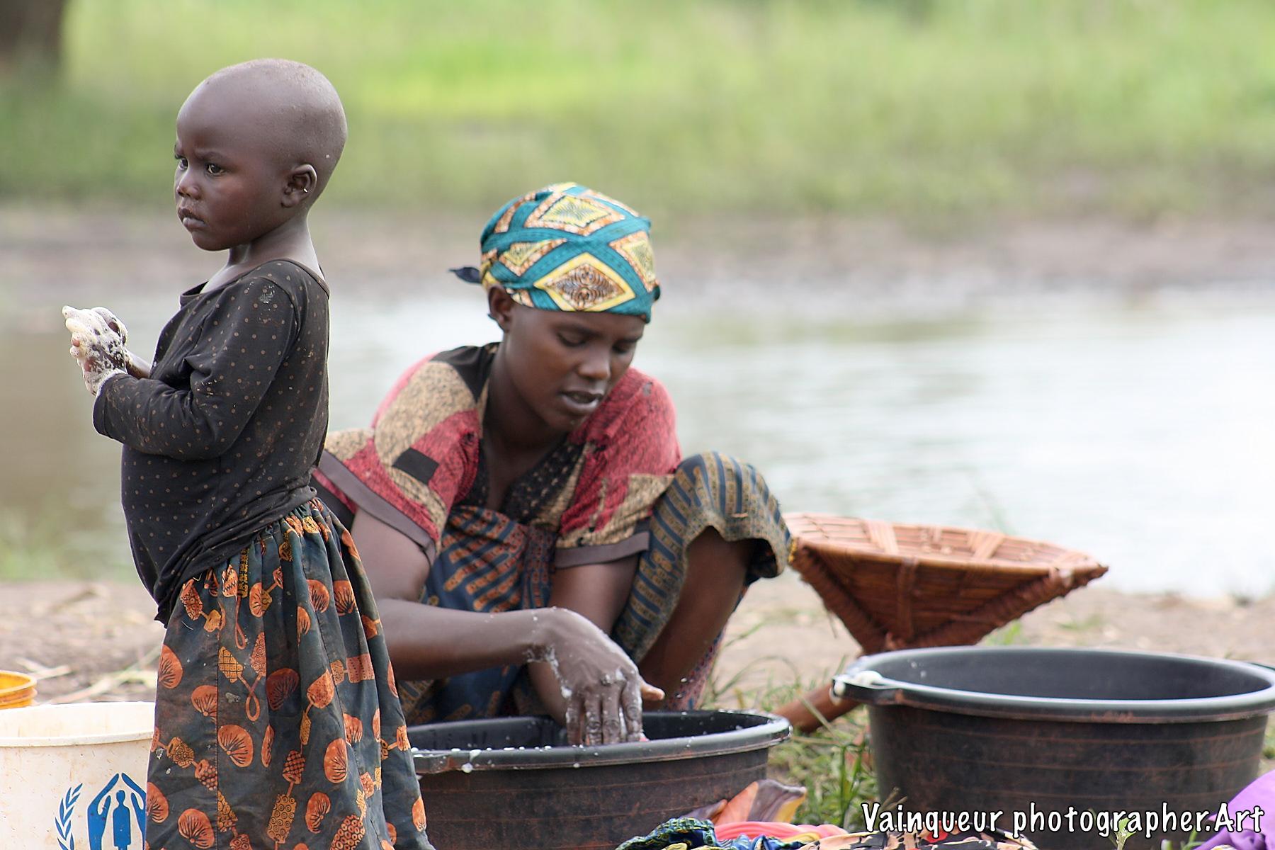 A woman with her small daughter washes laundry at the edge of the Kichiba stream in the south of Zone 8. This woman has left her village, where laundry places and taps are surrounded by other people to come and he cleans her clothes with stagnant water. The reason is that when rinsing the laundry with tap water, a large part of the soap remains during drying. Almost everyone we find by the river or by a stagnant water tells us this and also adds that there is a good climate for laundry by the river.