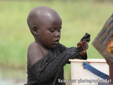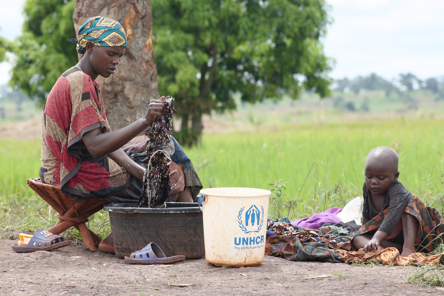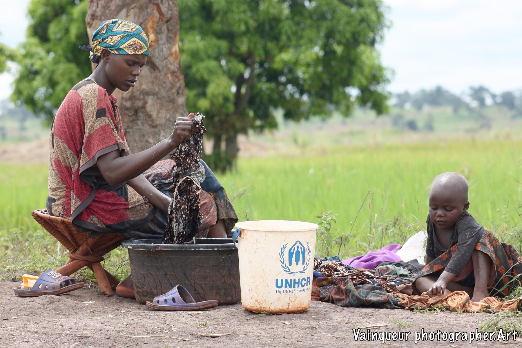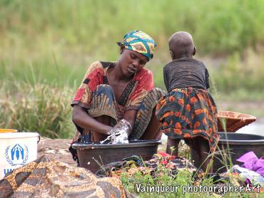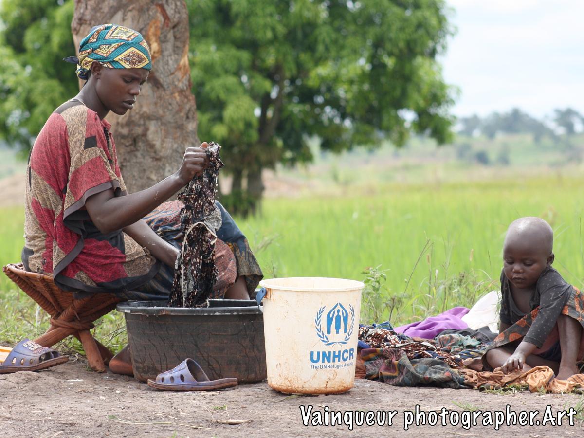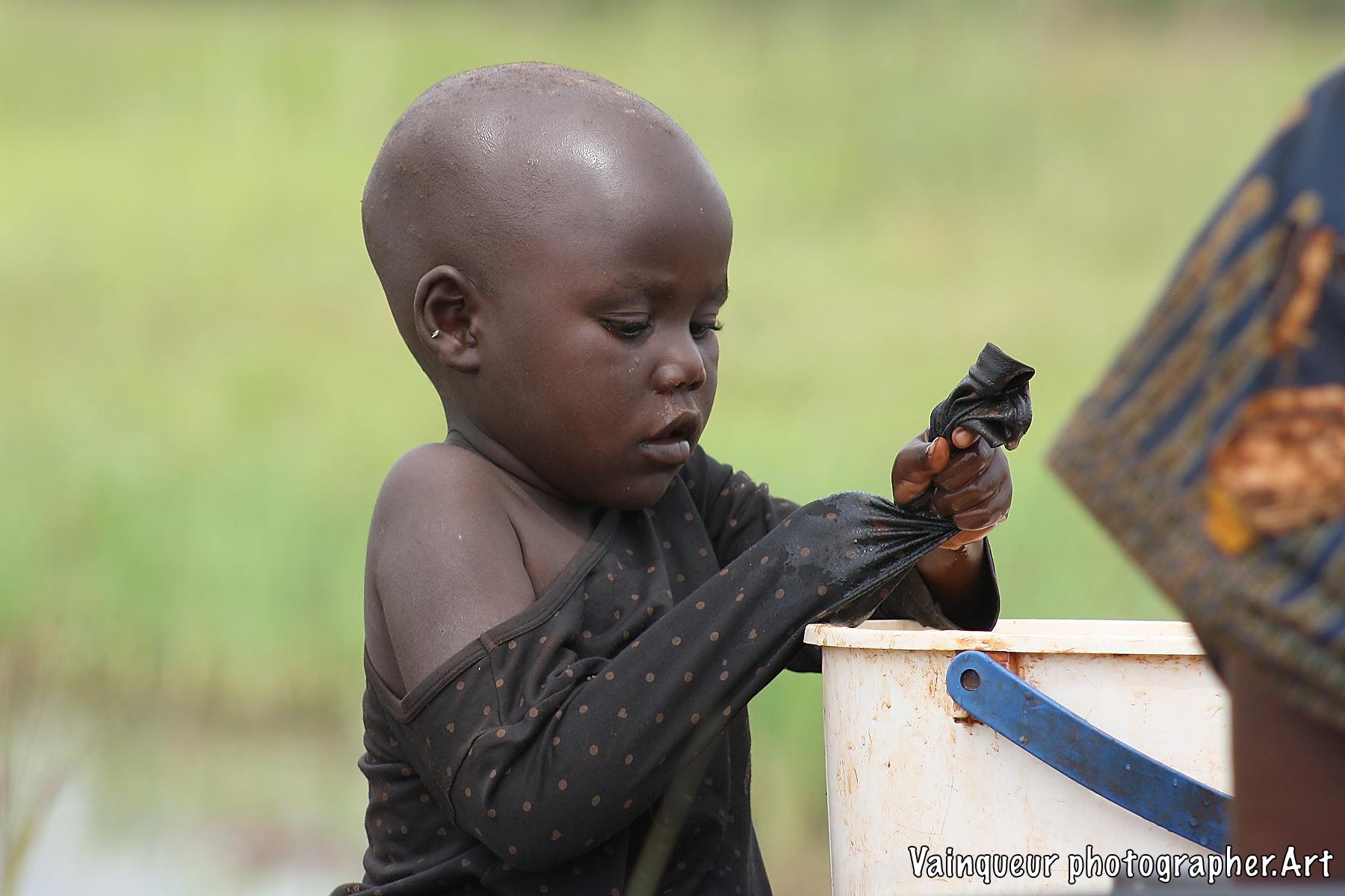 A woman with her small daughter washes laundry at the edge of the Kichiba stream in the south of Zone 8. This woman has left her village, where laundry places and taps are surrounded by other people to come and he cleans her clothes with stagnant water. The reason is that when rinsing the laundry with tap water, a large part of the soap remains during drying. Almost everyone we find by the river or by a stagnant water tells us this and also adds that there is a good climate for laundry by the river.