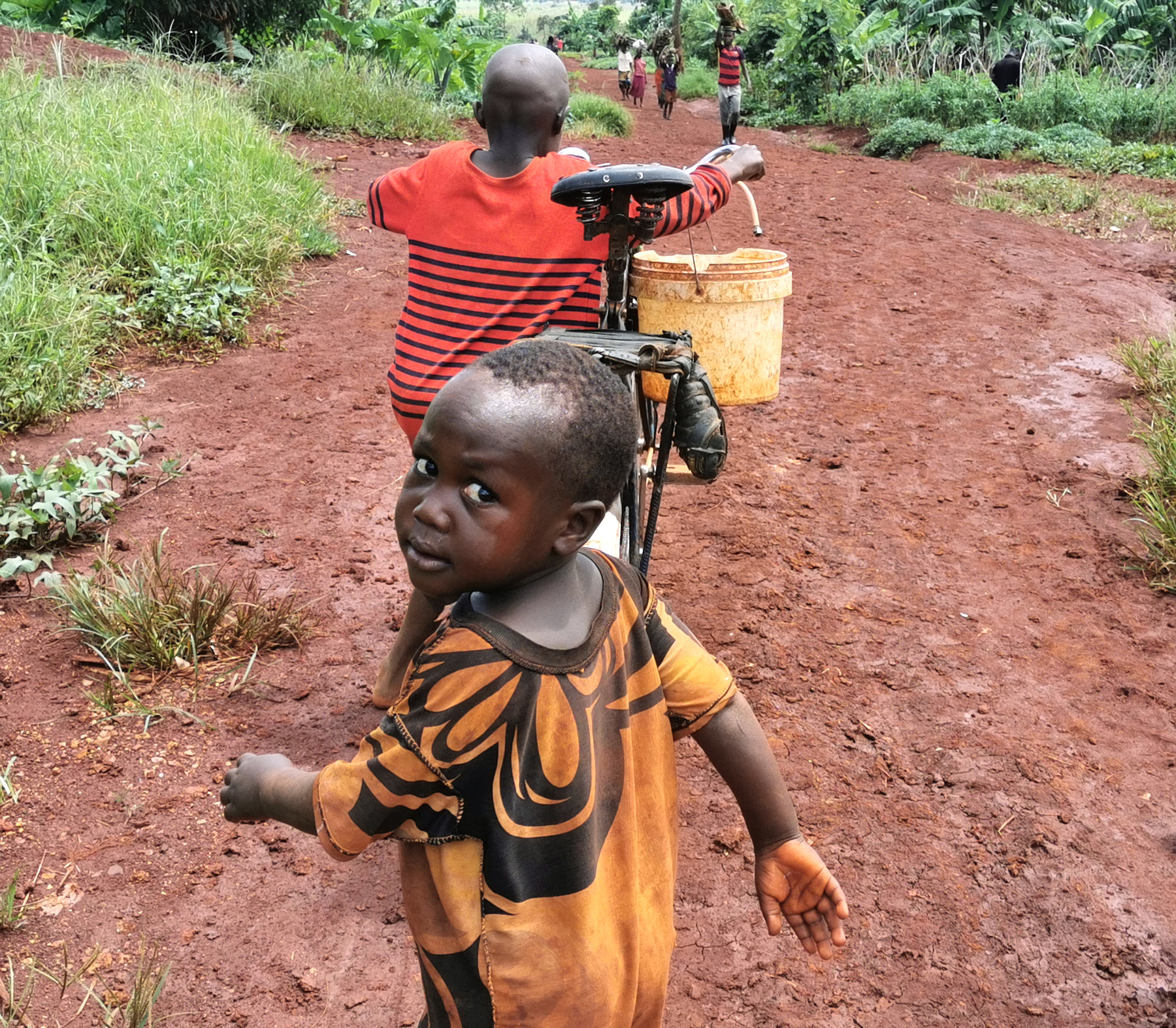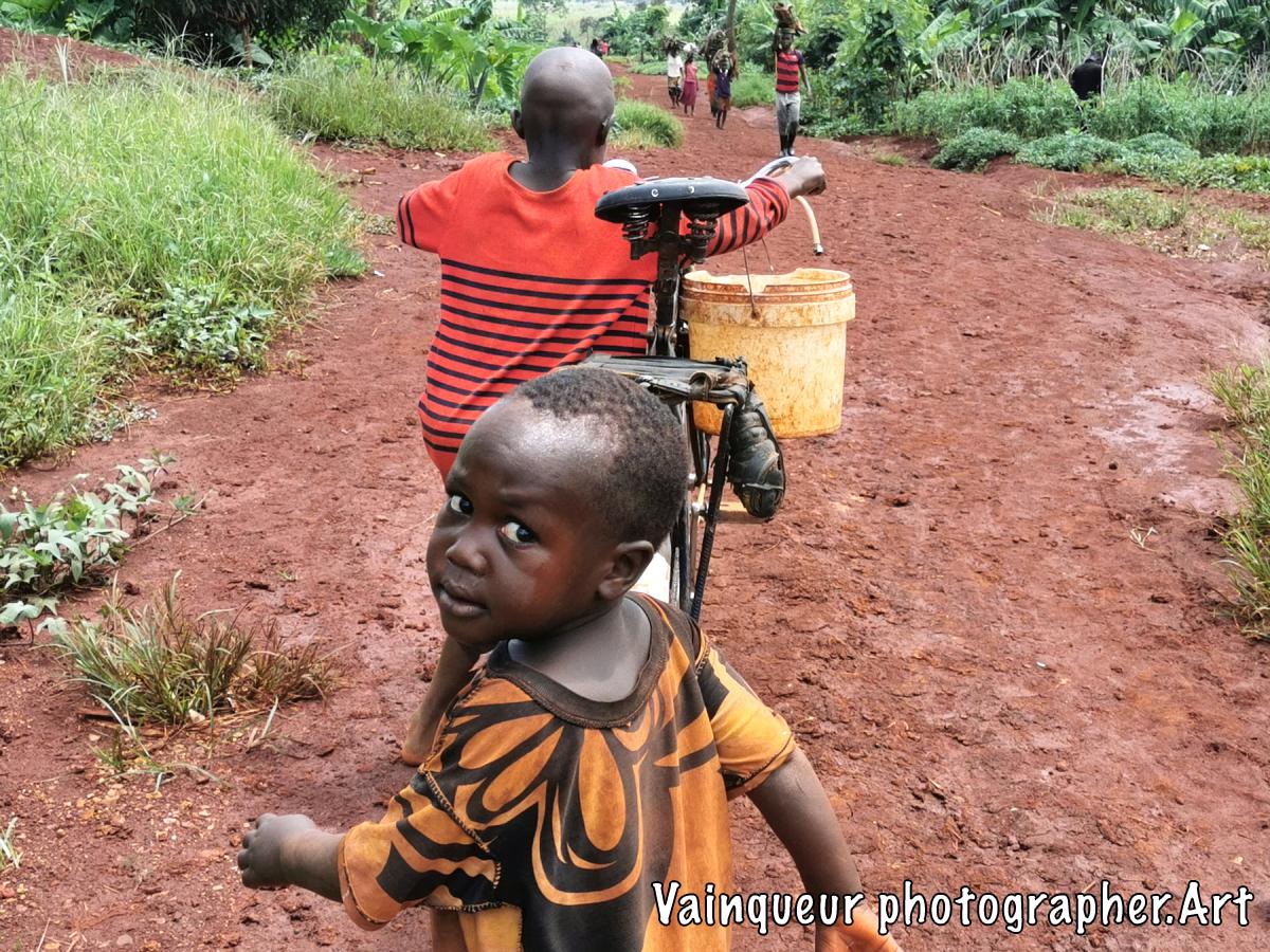 The two brothers have took the bike to help carry the water. They told us that their parents were in the fields. It therefore takes time to draw the water that their parents use to wash.